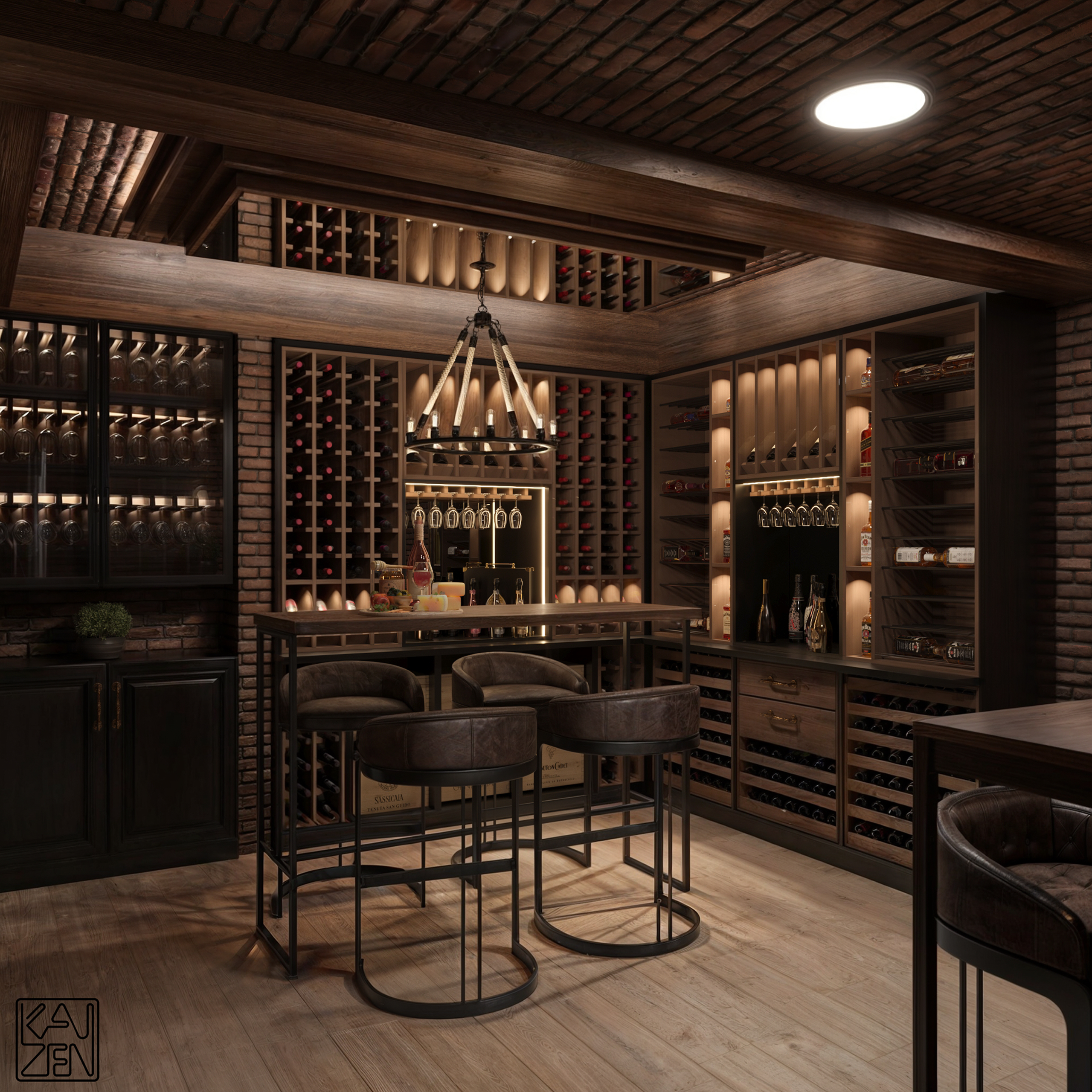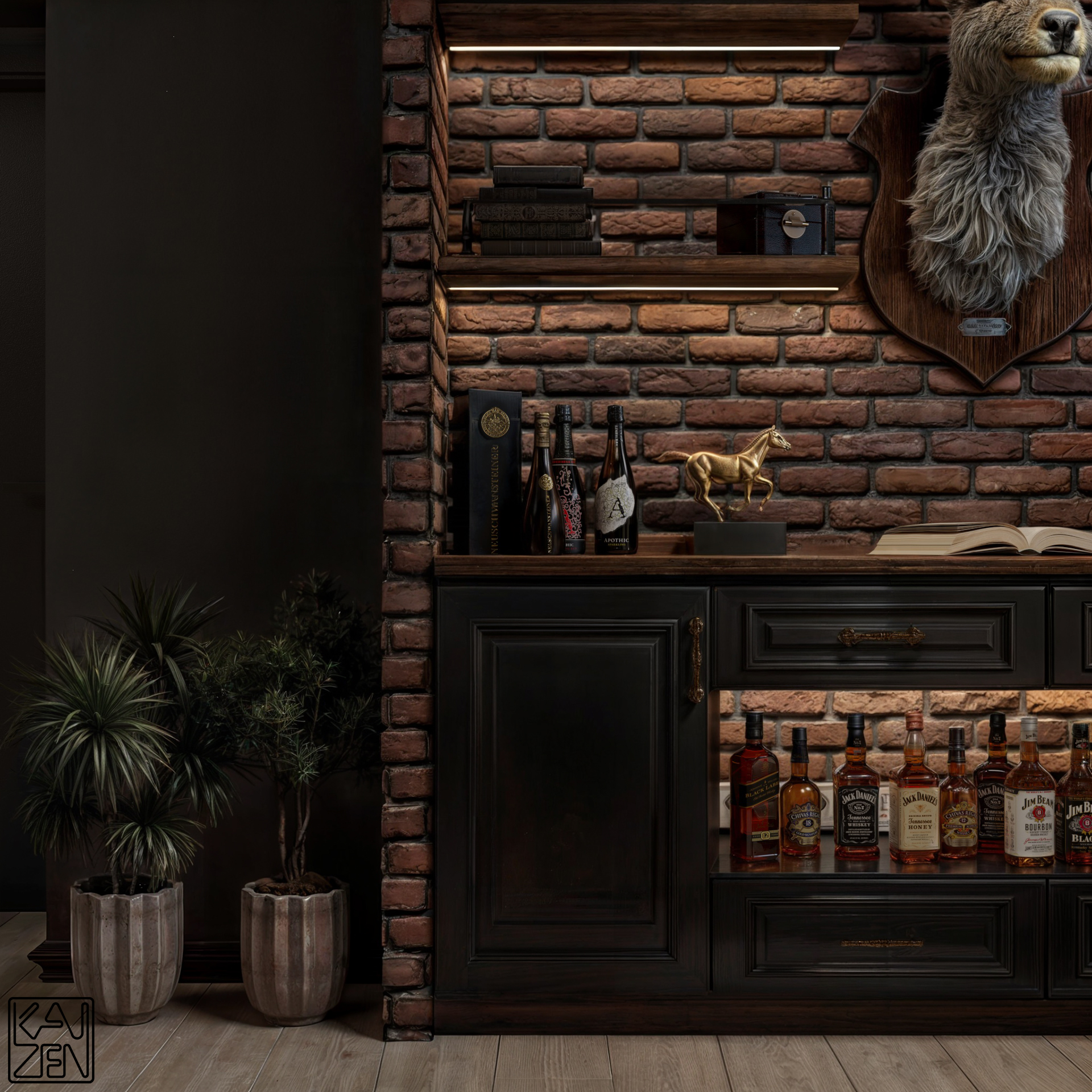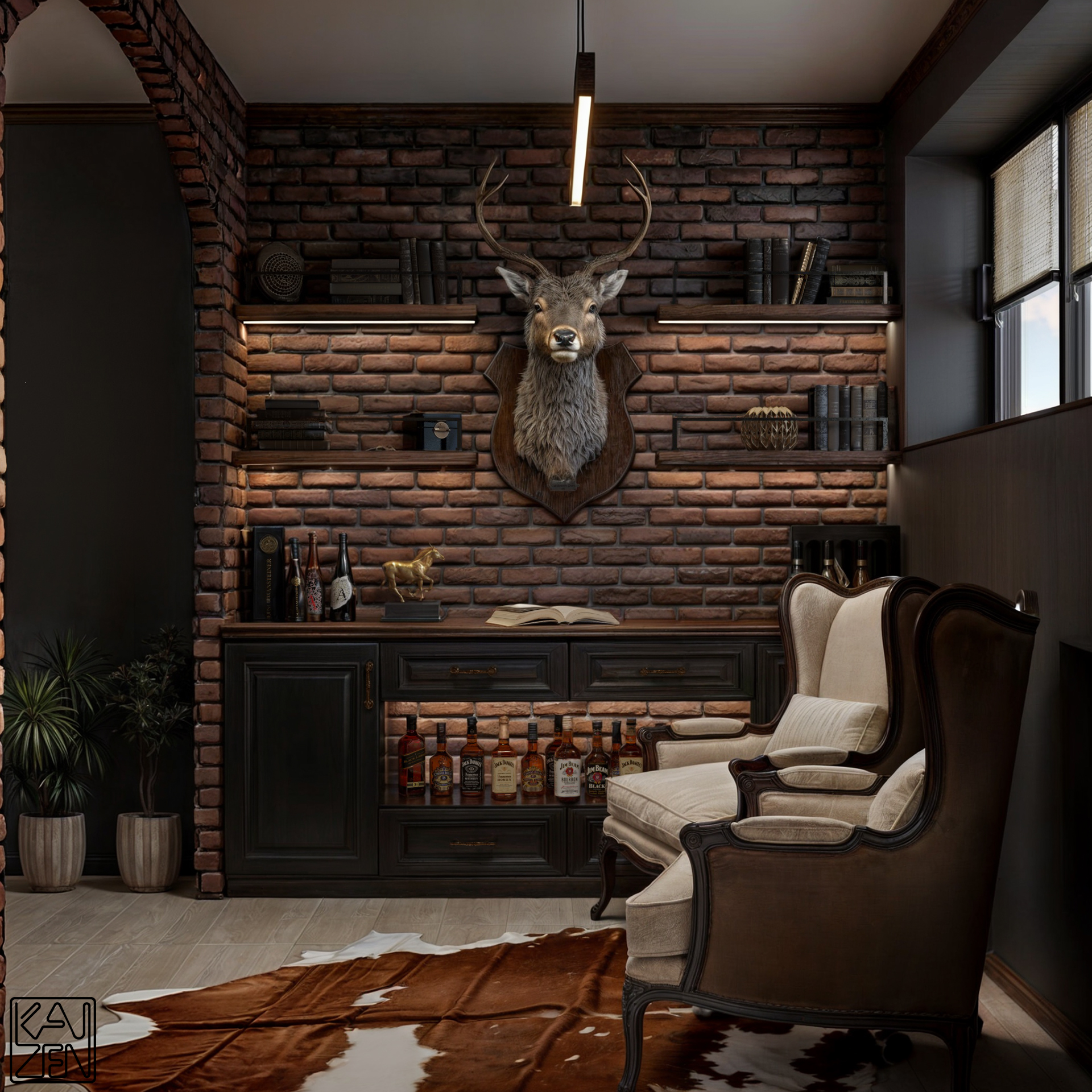 Exposed brick walls, rich wood cabinetry, and soft, ambient lighting create an atmosphere that feels intimate and grounded. Every detail is selected to evoke a sense of heritage: from the mounted deer head and curated shelves to the collection of fine whiskies showcased beneath the counter.