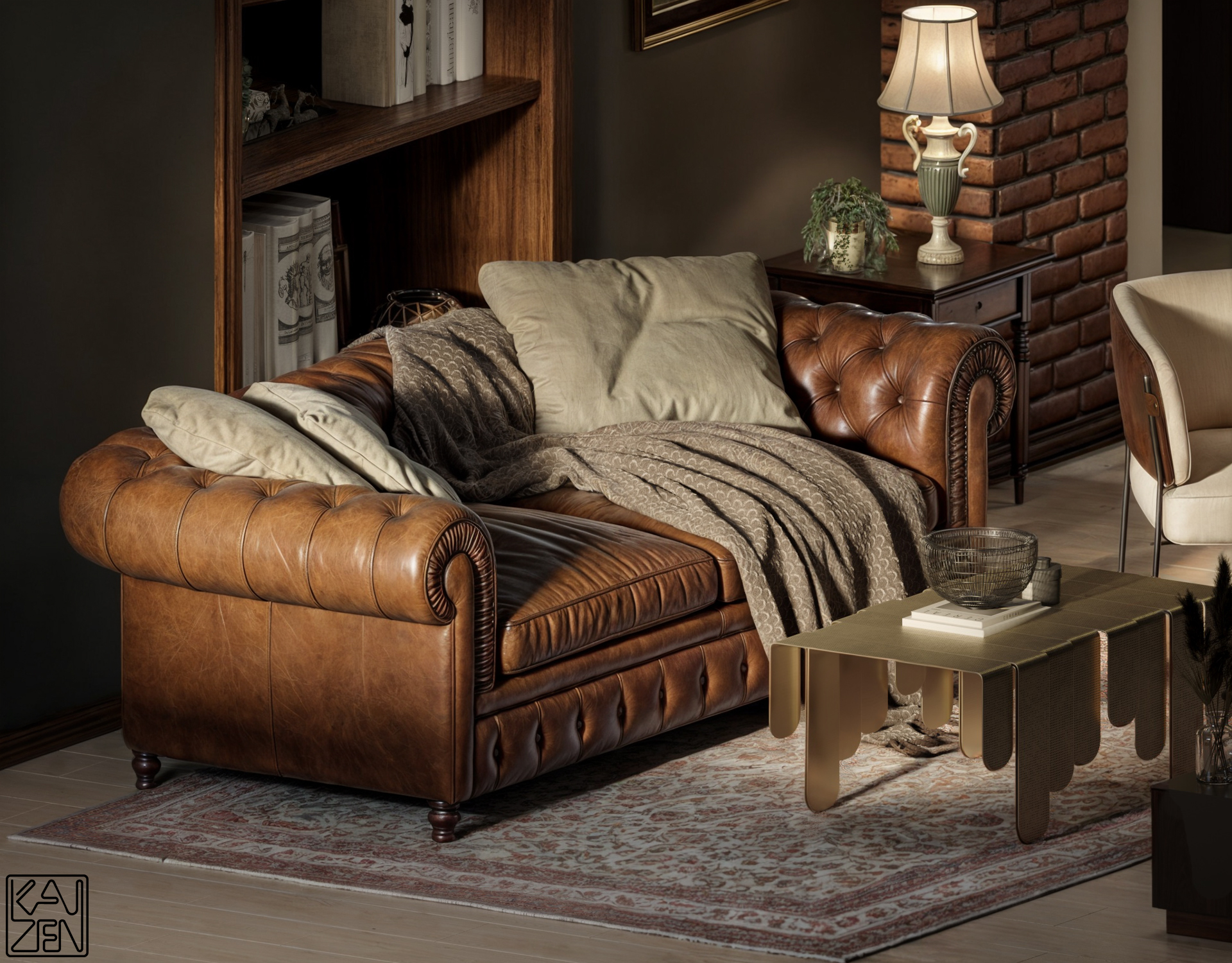 A handcrafted Chesterfield sofa, wrapped in aged caramel leather, becomes the heart of the space—inviting, lived-in, and effortlessly elegant. Soft throws, layered cushions, and the glow of traditional table lamps add a cozy, personal touch, balancing the room’s masculine structure with warmth and comfort.