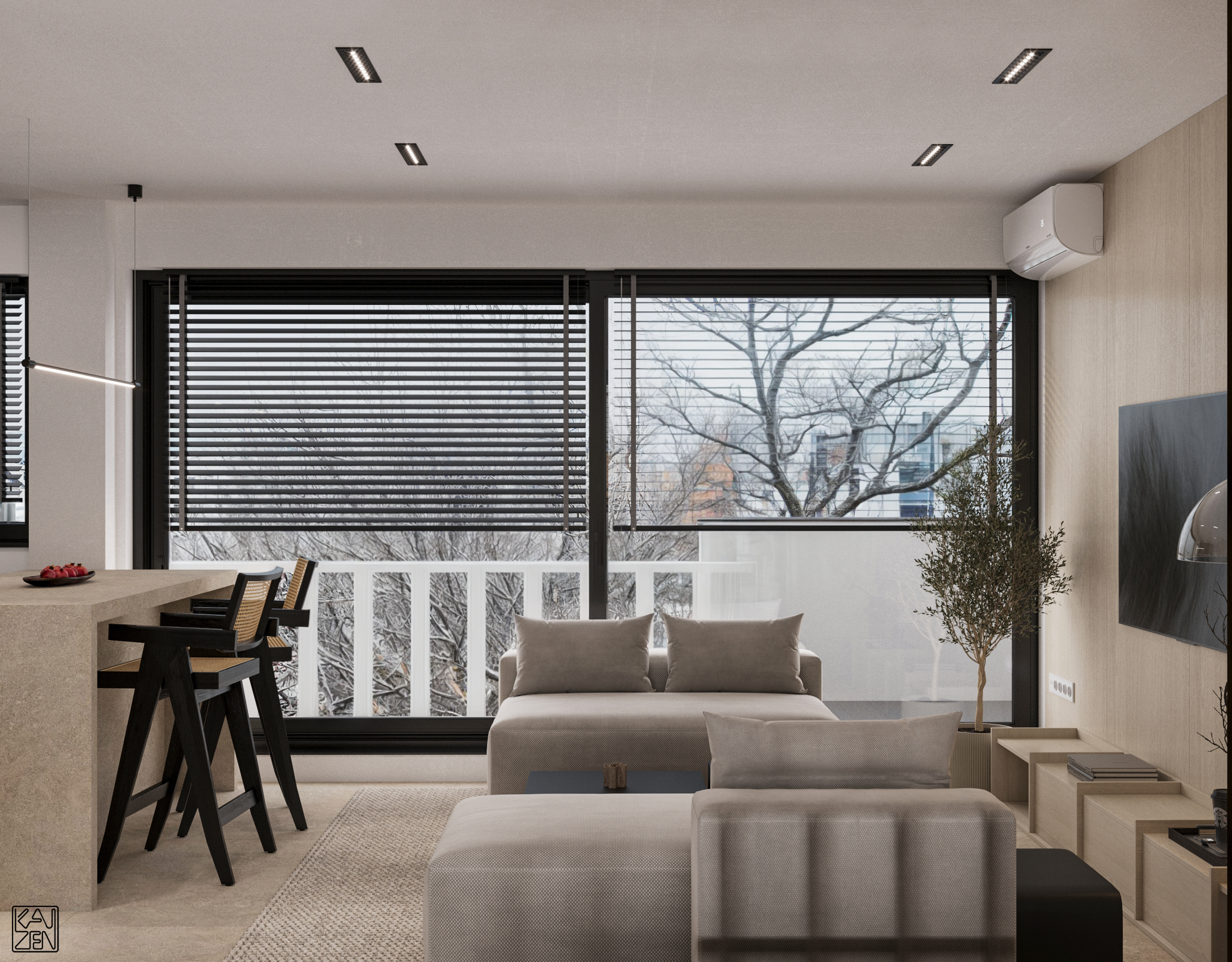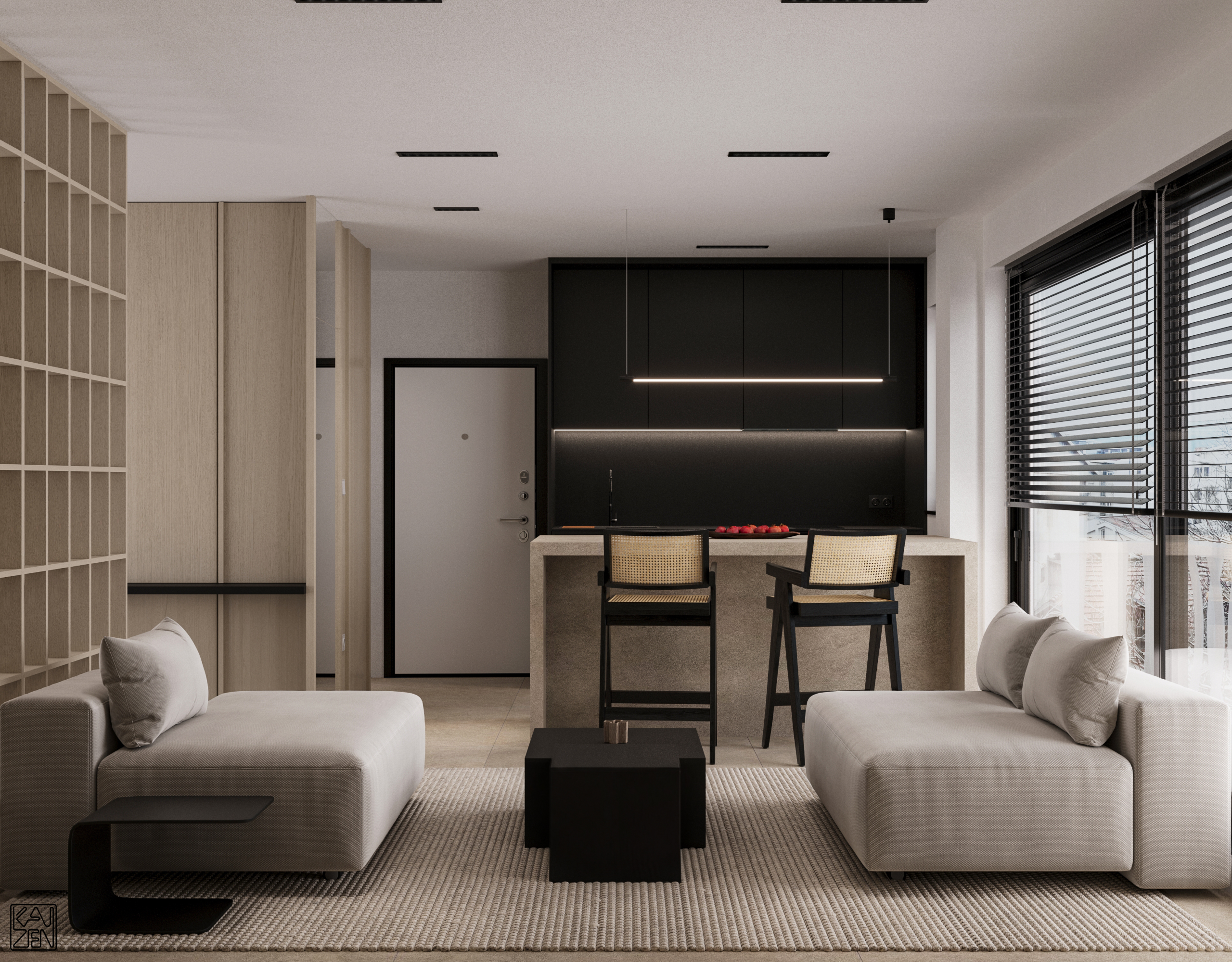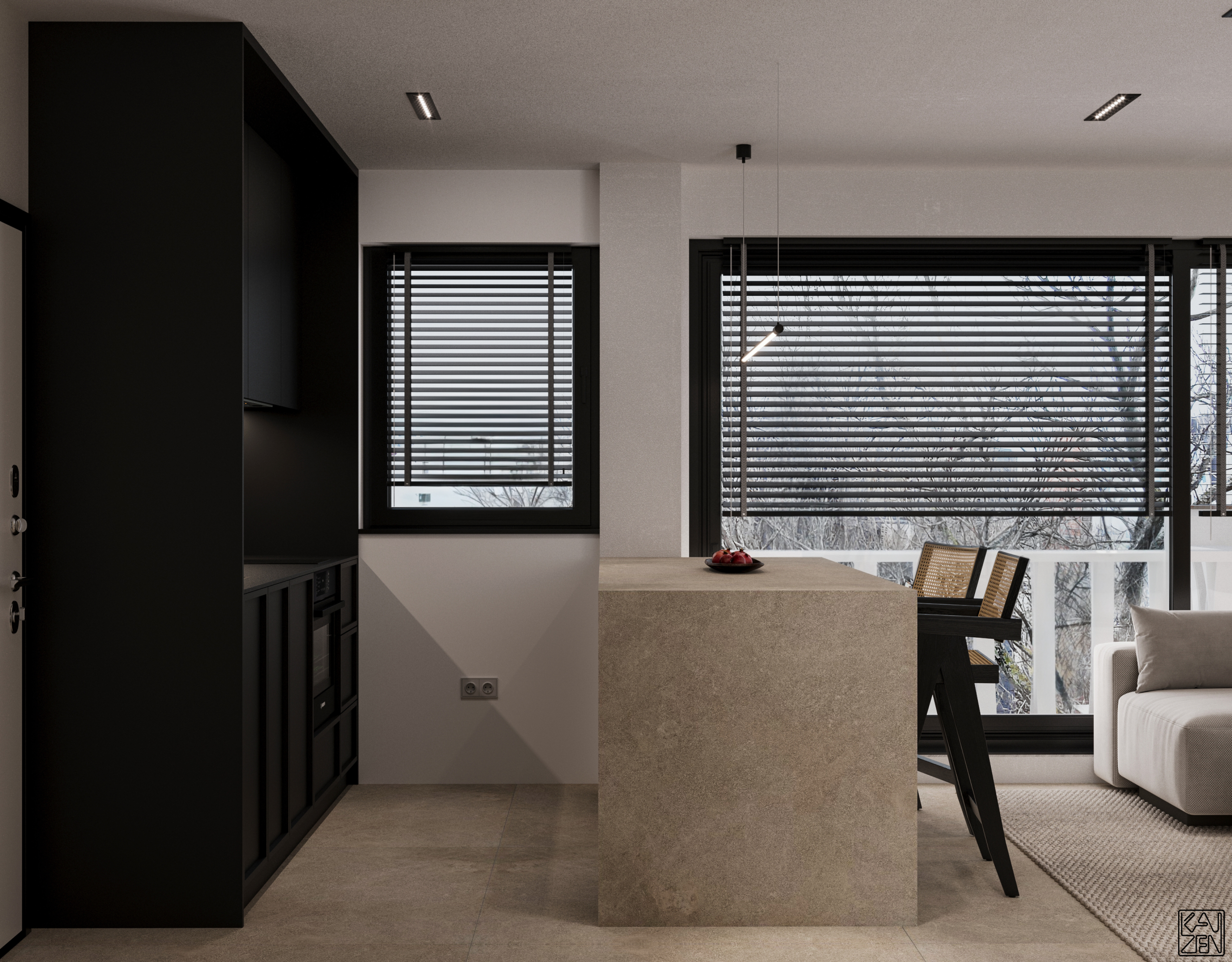The living area features two low lounge sofas, light wood paneling and subtle accents, forming a calm and inviting space filled with natural light from the large windows. The kitchen blends seamlessly into the layout, with a textured stone island and a sleek matte-black cooking zone that adds a modern, refined contrast.