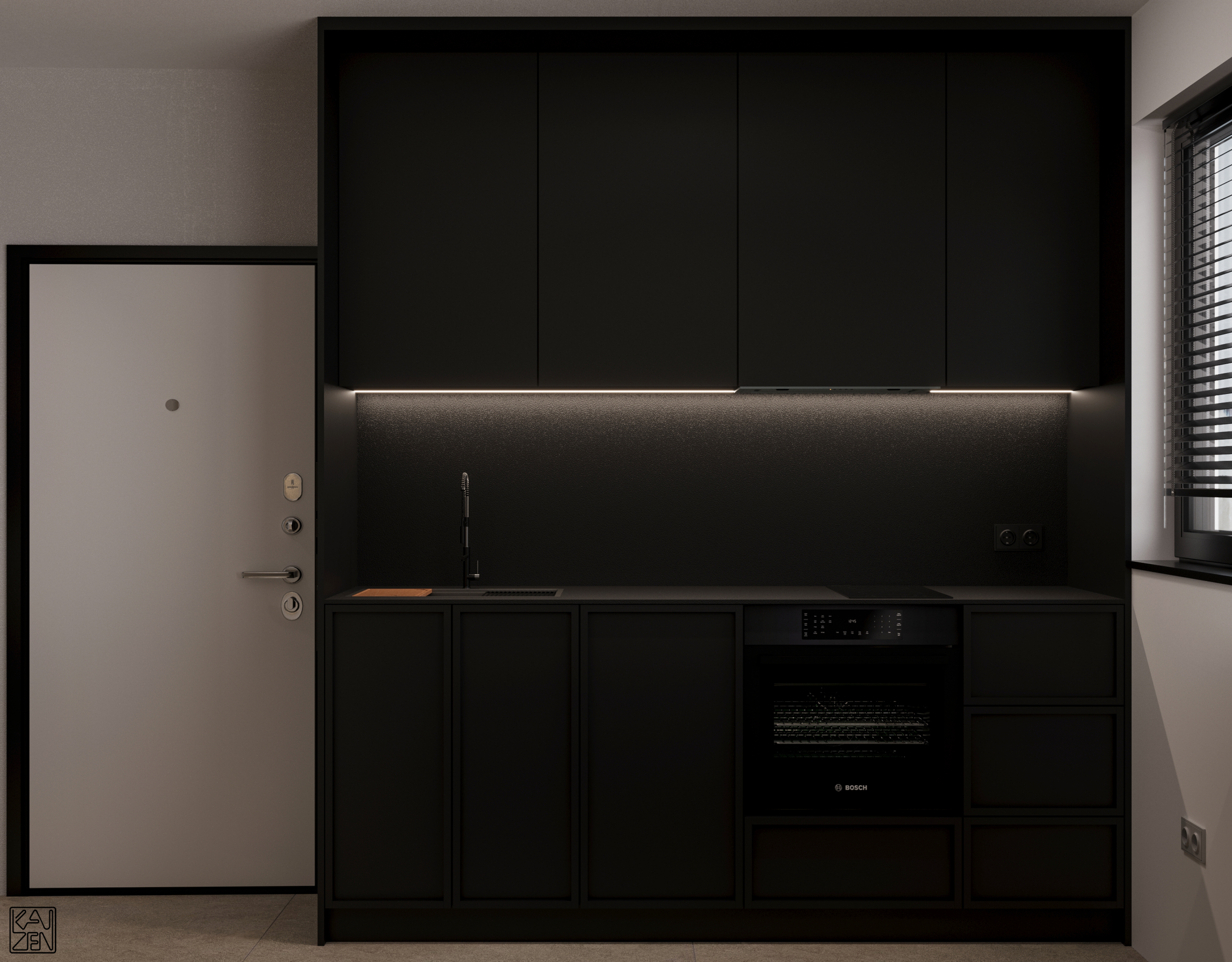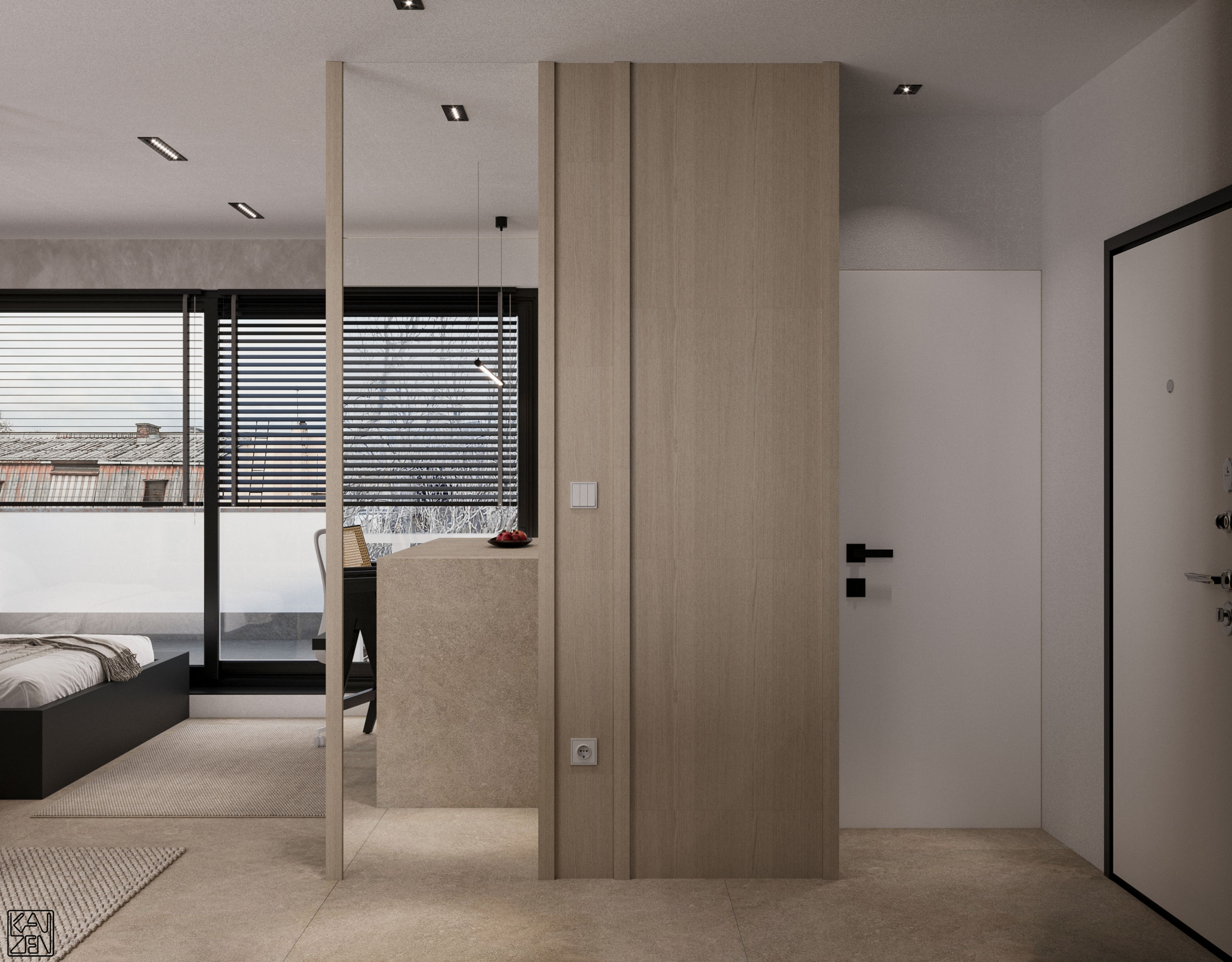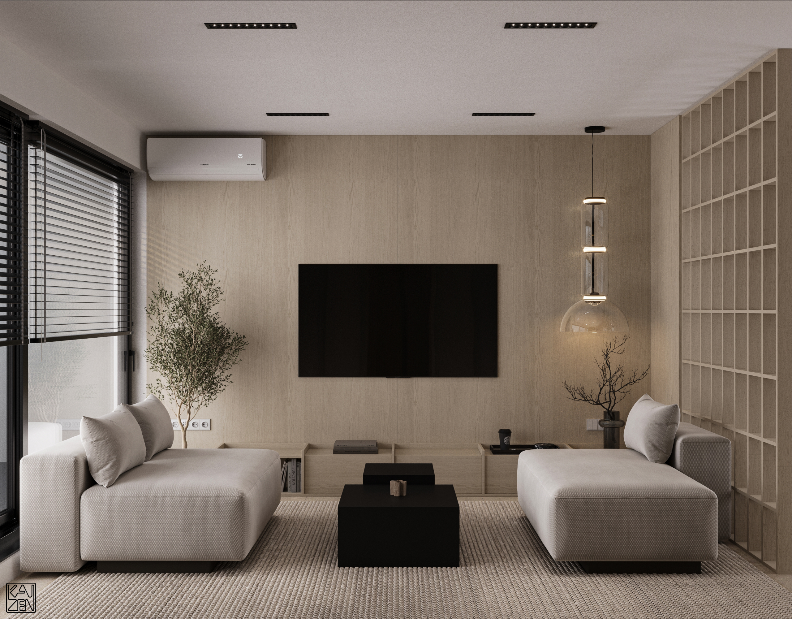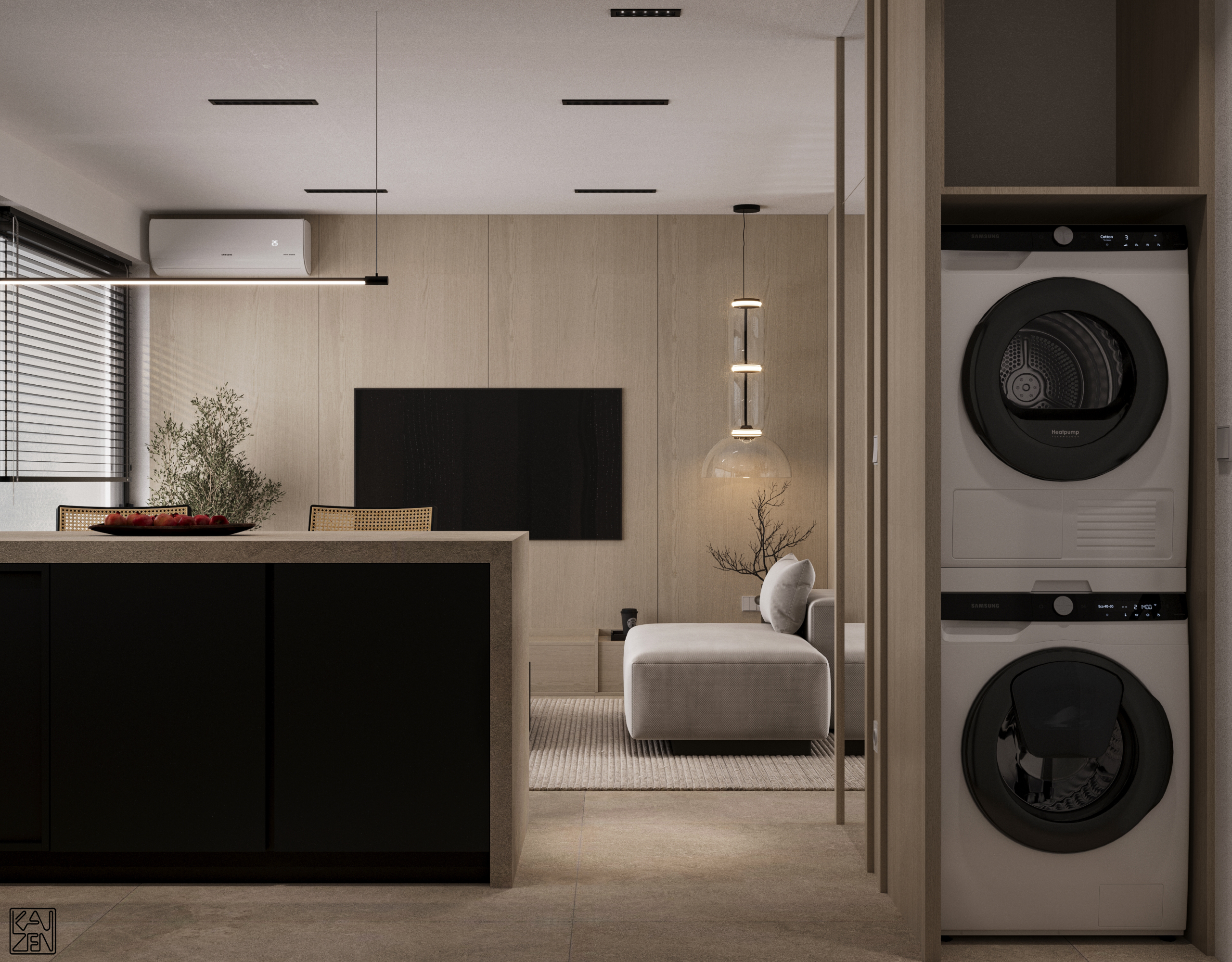 The living area features two low lounge sofas, light wood paneling and subtle accents, forming a calm and inviting space filled with natural light from the large windows. The kitchen blends seamlessly into the layout, with a textured stone island and a sleek matte-black cooking zone that adds a modern, refined contrast.