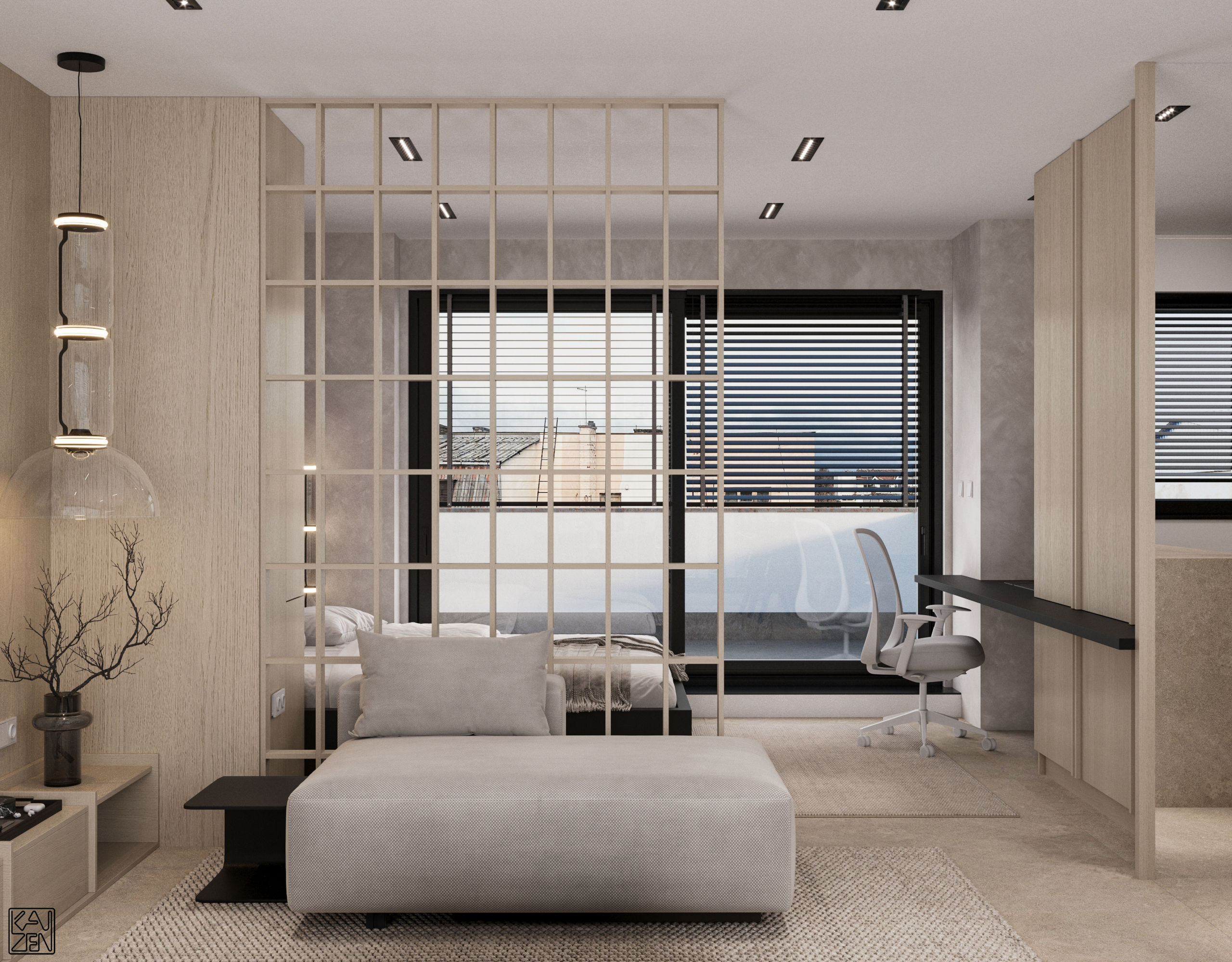 A light wooden grid softly separates the bedroom, keeping the space open while still providing privacy. The bedroom is defined by a bold black bed, warm lighting and curated artwork that adds personality and depth.