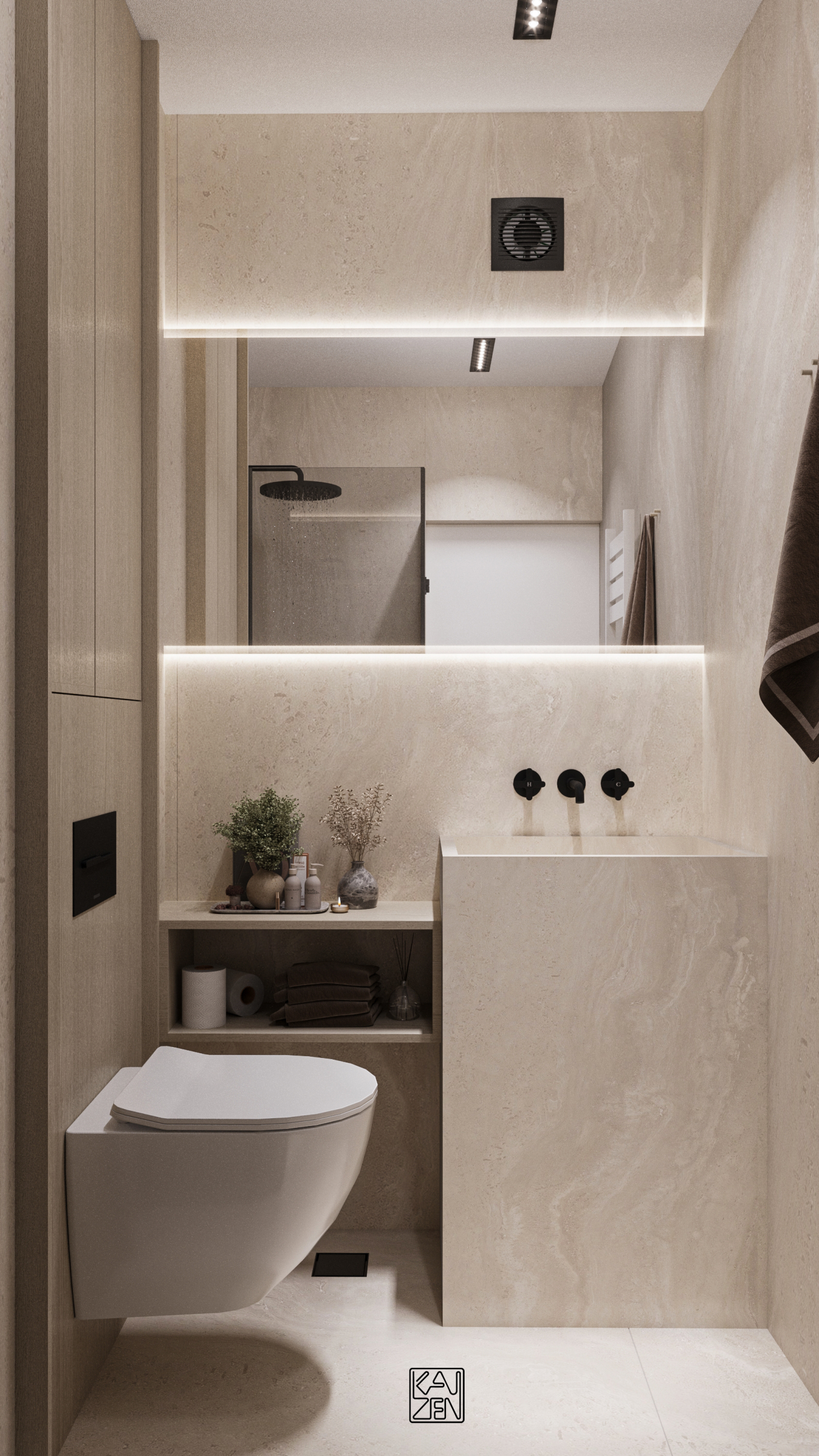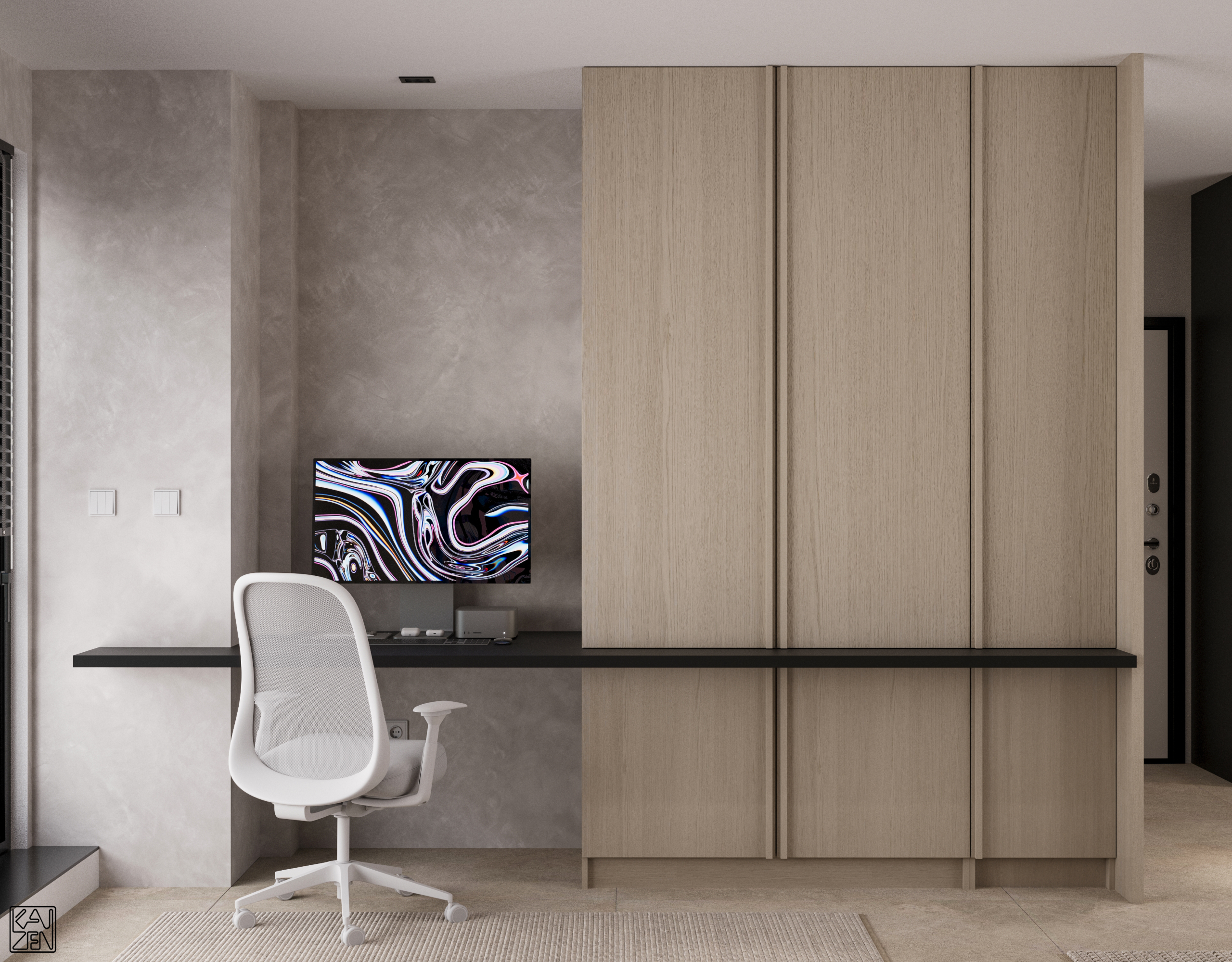 This interior embraces soft minimalism, combining natural materials, clean lines and a warm neutral palette to create a peaceful, comfortable atmosphere.