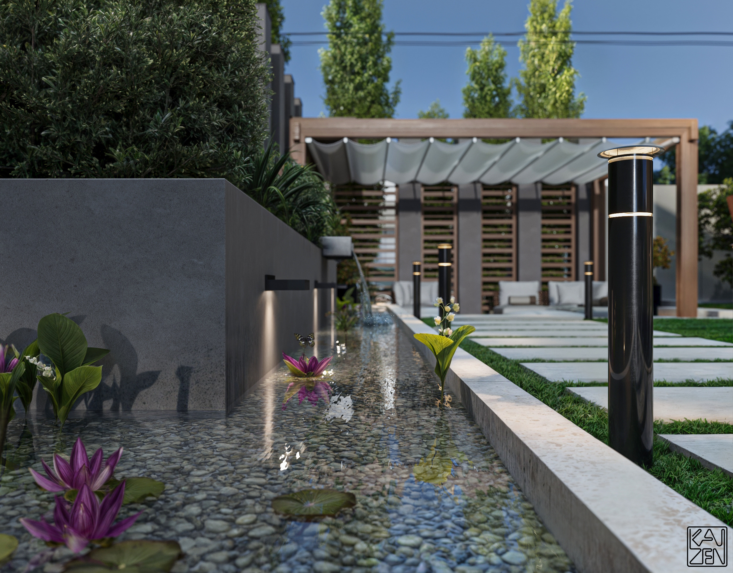 The surrounding garden is designed with structured planting, floating concrete pathways and subtle lighting that creates atmosphere from day to night. A tranquil water feature and carefully shaped shrubs bring movement and calm to the outdoor space.